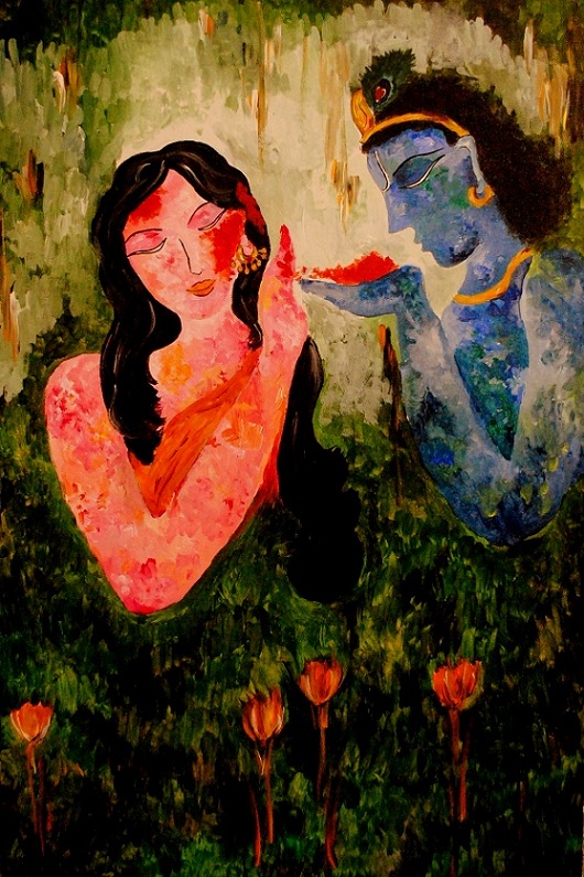 A painting inspired by the soulful Hindustanti bandish “Rang na daro Shaamji” in raag Sohani. Don’t pour colour on me, says the girl to Krishna at the festival of Holi.