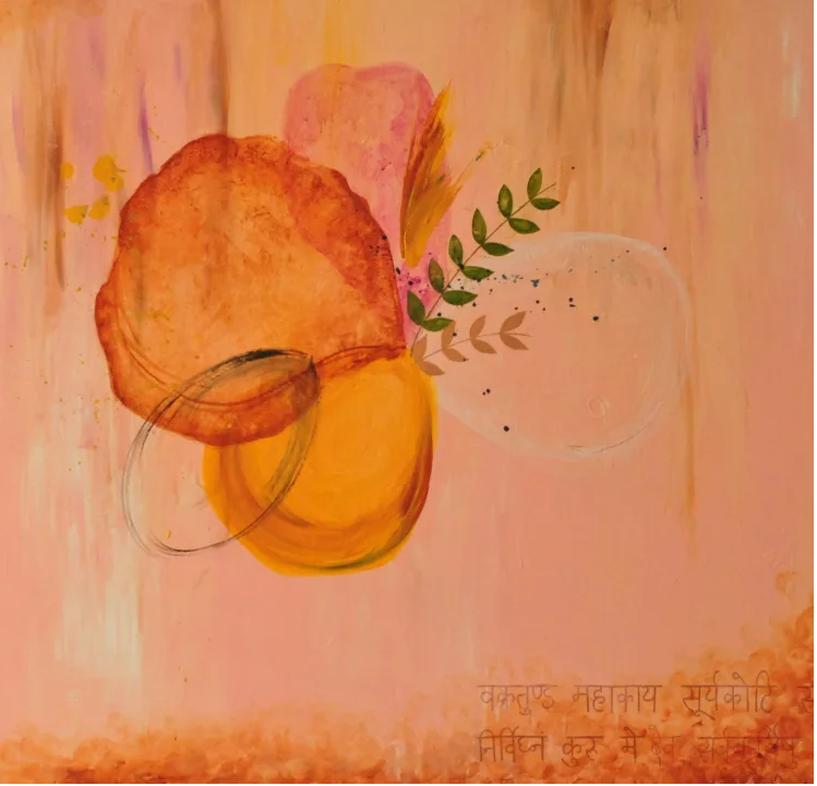 A soft painting with pastel floral themes. An invocation to the elephant god, magnificent as a million suns, seeking blessings for a smooth start, removal of obstacles and success in the undertaken endeavour.