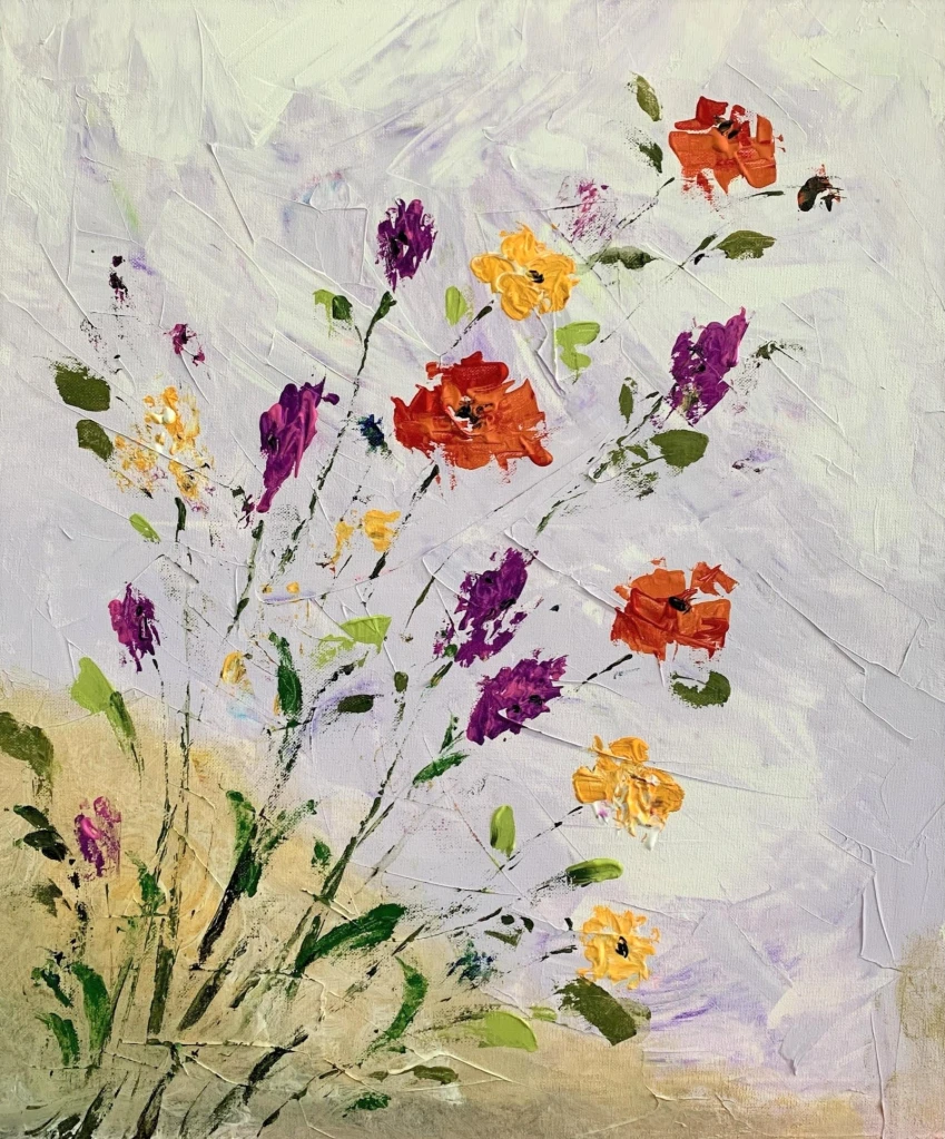 A mélange of spring flowers made with a splash of happy colours, playfully laid out with a palette knife.